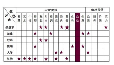 在市場走訪中南方略發(fā)現(xiàn),鋁門產(chǎn)品屬性同質(zhì)化現(xiàn)象十分嚴重,各品牌都開始在定位上下功夫。鋁門市場上能與皇派金門同臺競爭的品牌不出十個,主要包括“貴族之門圣堡羅”、主張“品質(zhì)、格調(diào)、創(chuàng)意”的派雅、“雅致、時尚”的致尚、標榜“藝術(shù)、時尚、個性”的新標以及主打情感牌的大洋等。南方略項目組經(jīng)研究發(fā)現(xiàn),盡管競爭品牌定位訴求概念眾多,其中有些品牌所提及的價值訴求過多,且與競爭對手出現(xiàn)“撞衫”現(xiàn)象;然而,仍有一些比較典型的價值要素(比如“品位”)尚未滿足消費者的心理需求,這就給皇派金門品牌定位留下了足夠的空間。慶幸的是,“品位”恰好與皇派金門品牌核心價值不謀而合。