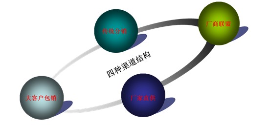 廠家直供:主要是針對(duì)政府及行業(yè)性招標(biāo)采購(gòu)、“麥德龍”等實(shí)施統(tǒng)一采購(gòu)的連鎖商超、電子商務(wù)等特殊通路,實(shí)施以公司總部為談判核心的廠家直供渠道模式。其渠道結(jié)構(gòu)為:廠家(→代理商)→最終用戶,其產(chǎn)品系列可單獨(dú)設(shè)計(jì)。
