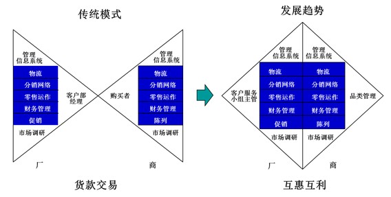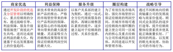 通過廠商互補(bǔ)以開發(fā)維護(hù)市場(chǎng):以核心、重點(diǎn)經(jīng)銷商為主要對(duì)象,市場(chǎng)開發(fā)與維護(hù)逐步實(shí)現(xiàn)由經(jīng)銷商單干的放羊式銷售向經(jīng)銷商為主、公司人員協(xié)助的協(xié)銷模式發(fā)展,最終發(fā)展為廠商共同開發(fā)維護(hù)市場(chǎng)的聯(lián)合式分銷模式。