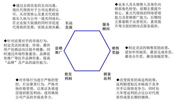 鎖定重點(diǎn)市場(chǎng)、豐富品類組合、細(xì)分渠道類型、優(yōu)化分銷網(wǎng)絡(luò)、完善服務(wù)機(jī)制、打造價(jià)值體系是“蜂巢工程”賴以成功的六大基石。