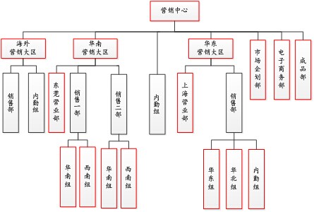 在營銷中心下面,按照區(qū)域進(jìn)行業(yè)務(wù)部門的設(shè)立,成立華南營銷大區(qū)、華東營銷大區(qū)、海外營銷大區(qū),并在各營銷大區(qū)下設(shè)銷售部,銷售部再按照客戶類型和更小范圍的區(qū)域進(jìn)行劃分。各業(yè)務(wù)部門在自己所屬的區(qū)域內(nèi)進(jìn)行客戶的開發(fā)和維護(hù),將客戶開發(fā)和維護(hù)下沉至更小的區(qū)域市場。隨著區(qū)域市場的發(fā)展,營銷大區(qū)下設(shè)的銷售部能夠?qū)崿F(xiàn)分離,實(shí)現(xiàn)營銷大區(qū)的快速復(fù)制。