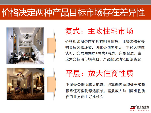 1、公寓產(chǎn)品市場認(rèn)可度較高,但兩種公寓產(chǎn)品市場熱度差別大,根據(jù)前期綠筑測算價格,復(fù)式公寓贈送空間大,價格優(yōu)勢明顯,平層公寓無贈送,且公攤高,缺乏市場競爭力,由價格決定兩種細(xì)分產(chǎn)品目標(biāo)市場存在差異。復(fù)式相較周邊住宅具有明顯優(yōu)勢,主攻住宅市場,以年輕夫妻和老年家庭為主;平層細(xì)算套內(nèi)處于劣勢,需要放大項(xiàng)目商業(yè)性質(zhì),在商業(yè)方向上尋找機(jī)會,建議方向以中端商務(wù)公寓式酒店或小型辦公商務(wù)區(qū)為主。