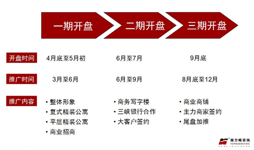又根據(jù)時間規(guī)劃,建議項(xiàng)目分為三期推盤,并對每次推盤的時間,宣傳推廣時間及推廣內(nèi)容做了明確的規(guī)劃及部署。