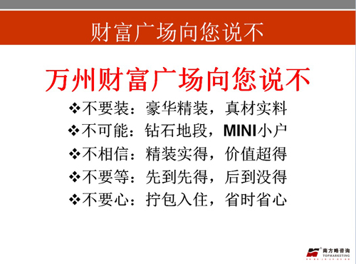 在第一輪強(qiáng)銷階段,配合MINI戶型產(chǎn)品的推出,深度挖掘產(chǎn)品特性,推出“不要裝、不可能、不相信、不要等、不要心”系列“財(cái)富廣場(chǎng)向您說不”廣告,打破常規(guī),牢牢抓住消費(fèi)者眼球,開展“逆向思維”廣告宣傳攻勢(shì),在前期媒體宣傳的基礎(chǔ)上,增加“開盤活動(dòng)(事件營銷)、DM單面派發(fā)、社區(qū)海報(bào)張貼”等動(dòng)作營銷,把視覺與行動(dòng)緊密聯(lián)合起來,把宣傳勢(shì)頭推向一波高潮。