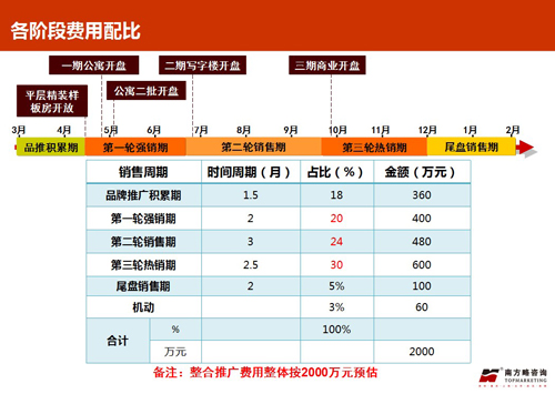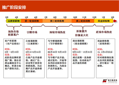 南方略根據(jù)項(xiàng)目的進(jìn)度及全年?duì)I銷節(jié)點(diǎn)特征,結(jié)合全年推廣費(fèi)用的預(yù)算安排,因地制宜選擇適合的推廣載體及手段,安排財(cái)富廣場(chǎng)的推廣階段及計(jì)劃!