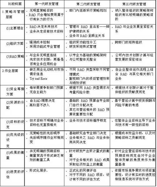 基于戰(zhàn)略的IPD模式。由于市場化競爭加強,企業(yè)在同質(zhì)化的時代發(fā)現(xiàn)沒有核心競爭差異,所以這段時間就出現(xiàn)了從品牌到戰(zhàn)略甚至文化能力的打造,所以此階段基于戰(zhàn)略和文化的管理模式,更加符合市場和企業(yè)管理的思維,也更加切實可行,此階段以IPD的研發(fā)管理模式為領(lǐng)軍代表。前三個階段模式的細分對比可以見下表: