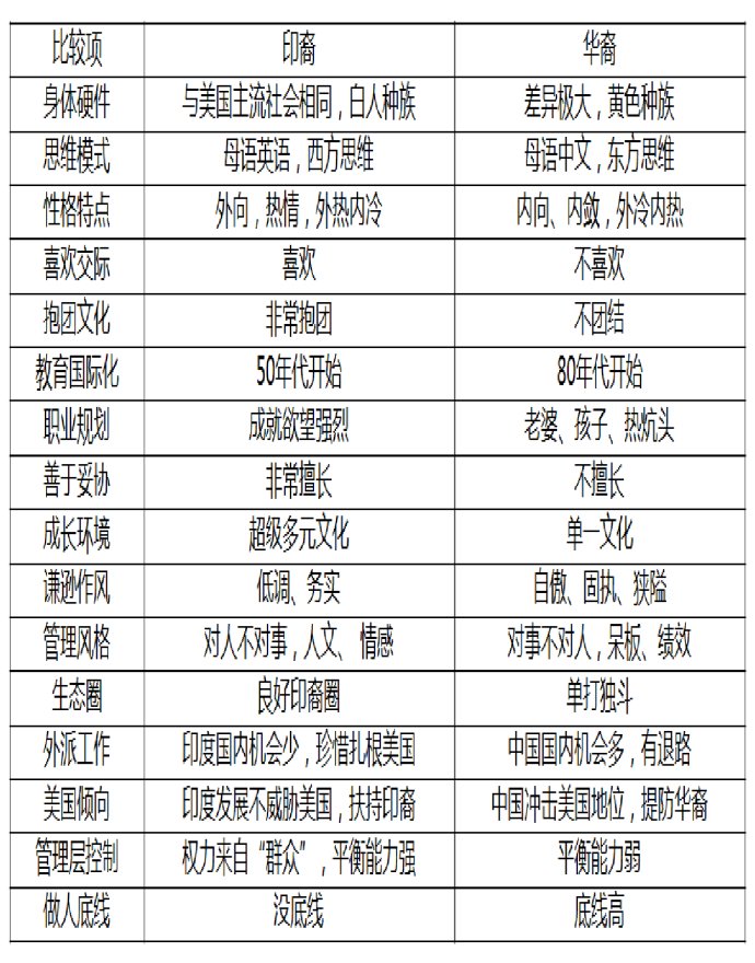 國(guó)外世界500強(qiáng)或美國(guó)500強(qiáng)掌門(mén)人、硅谷創(chuàng)業(yè)公司、哈佛的教授、麥肯錫的顧問(wèn)、商學(xué)院院長(zhǎng)多是印裔;在硅谷,印裔就業(yè)人口6%,但創(chuàng)業(yè)公司占16%;美國(guó)的高科技企業(yè),大體結(jié)構(gòu):中國(guó)人為基層,印度人中層,本地白人為高層;美國(guó)印裔只占1%,但在大公司的高管人數(shù)僅次于美國(guó)本土白人,遠(yuǎn)超過(guò)華裔。