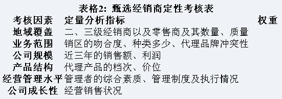 ◆ 厘定經(jīng)銷商標(biāo)準(zhǔn) 招商就如找對(duì)象談戀愛結(jié)婚生子,非常重要。經(jīng)銷商的厘定擇用,關(guān)系到后期招商政策制定執(zhí)行,關(guān)系到分銷網(wǎng)點(diǎn)覆蓋目標(biāo)市場(chǎng)的密度,關(guān)系到銷售目標(biāo)業(yè)績(jī),乃至關(guān)系到今后經(jīng)銷商輔導(dǎo)與支援、激勵(lì)、控制等工作的進(jìn)展。通常經(jīng)銷商厘定主要內(nèi)容有:經(jīng)銷商原則、選擇條件、判斷標(biāo)準(zhǔn)以及經(jīng)銷商調(diào)查、評(píng)定與甄別等。如何厘定經(jīng)銷商試以下表格來主述: