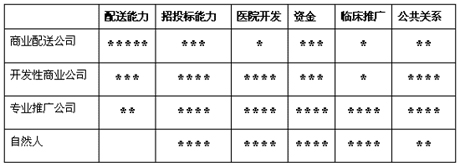 以上不同類型經(jīng)銷商在配送能力、招投標(biāo)、臨床推廣、公共關(guān)系等關(guān)鍵環(huán)節(jié)各有優(yōu)缺點(diǎn),如下表所示: