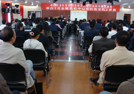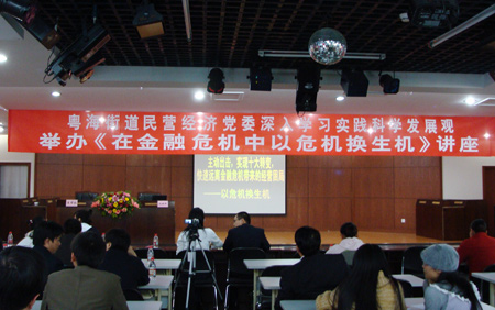 08年12月27日,劉祖軻在南山區(qū)進(jìn)行了主題為“主動(dòng)出擊,實(shí)現(xiàn)十大轉(zhuǎn)變快速遠(yuǎn)離金融危機(jī)帶來(lái)的經(jīng)營(yíng)困局——以危機(jī)換生機(jī)”的講座。