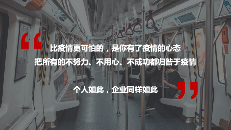面對疫情,千萬不要恐慌、害怕、過度焦慮!不要為疫情狀況下業(yè)績完成情況與年初既定目標(biāo)之間的差距而恐慌——極有可能,競爭對手比你更差呢!最為關(guān)鍵的是,找到方法,如何進(jìn)行行動(dòng)與趕超!