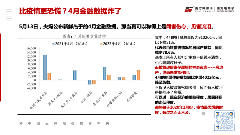 比疫情更可怕的,還有央媽公布的新鮮熱乎的4月金融數(shù)據(jù)!現(xiàn)在經(jīng)濟(jì)的萎縮程度、居民預(yù)期的走低程度,相較于2020年2月份有過之無不及。并且,很大概率上,2022年的下半年會比上半年更加難熬,無論是防疫、物價(jià)、就業(yè)、供應(yīng)鏈、收入、通脹、消費(fèi)等各個(gè)層面,企業(yè)和個(gè)人都需要提前做好準(zhǔn)備,適應(yīng)“疫情常態(tài)化”這一全新的社會秩序。