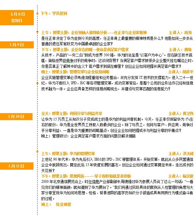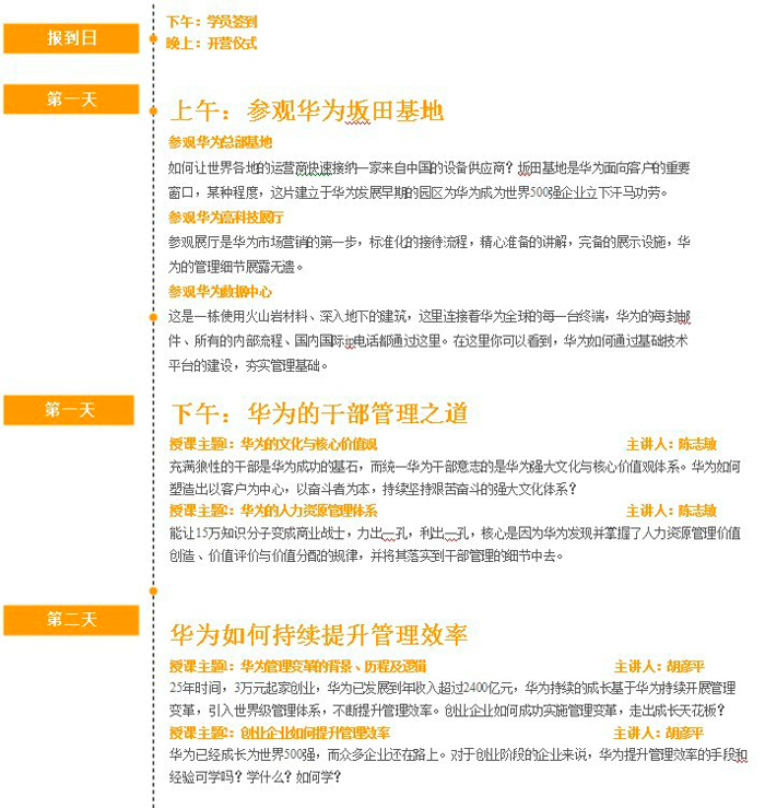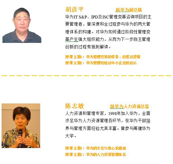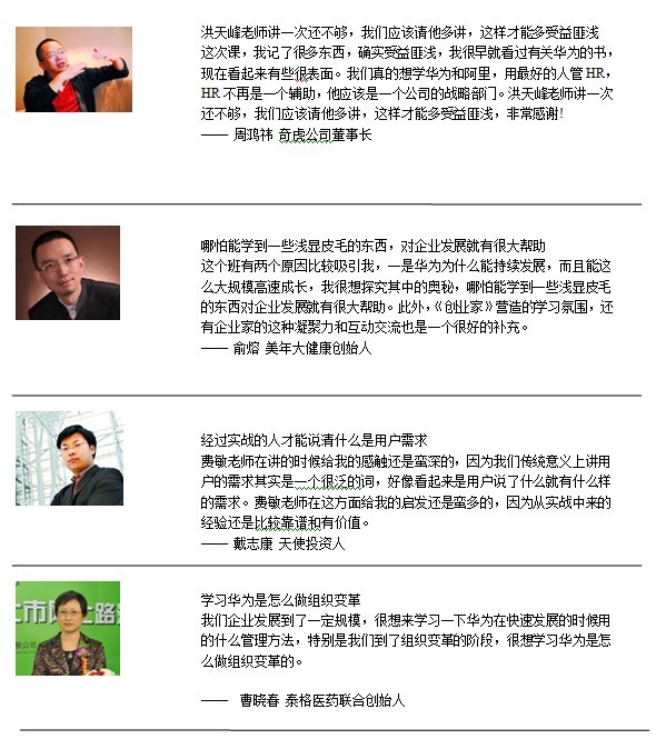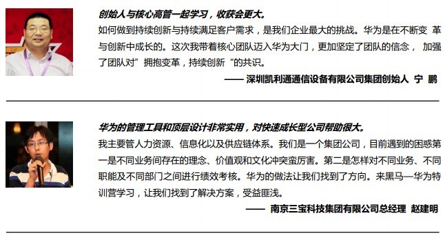 在黑馬—華為特訓(xùn)營(創(chuàng)始人班),我們將追隨幾位先生,學(xué)習(xí)體驗(yàn)華為的成長經(jīng)歷、審視我們的創(chuàng)業(yè)模式,經(jīng)驗(yàn)也許不能復(fù)制,但一定能夠給你啟迪。