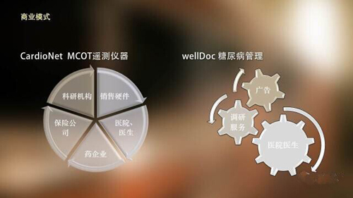 美國的cardioNet,提供一種心臟監(jiān)測設(shè)備,他們硬件銷售就有贏利,還要收醫(yī)院、藥企、保險、科研的費用,因為他們提供數(shù)據(jù)服務(wù)。
