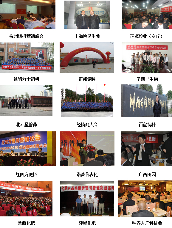 山東魯西化工(系統(tǒng)營(yíng)銷)、江蘇中東化工(差異化營(yíng)銷)、廣西北斗星動(dòng)保(品牌營(yíng)銷)、深圳圣西馬動(dòng)保(系統(tǒng)營(yíng)銷)、四川鐵騎力士母豬料(新品策劃與上市)、湖南優(yōu)久農(nóng)牧(大單品策劃與上市)等。