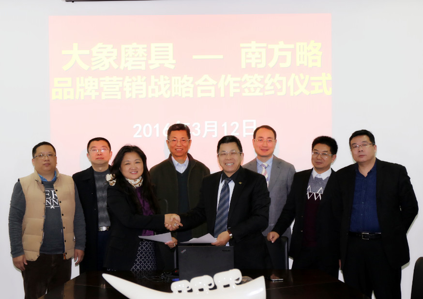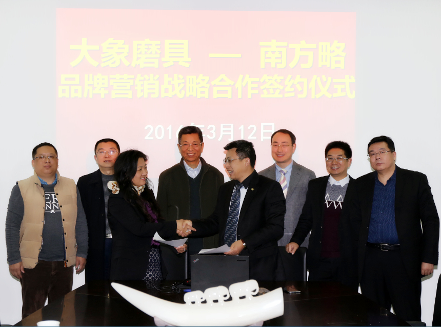 中品會主席王漢武、南方略董事長劉祖軻與大象磨具董事長鄒艷玲簽約合影
